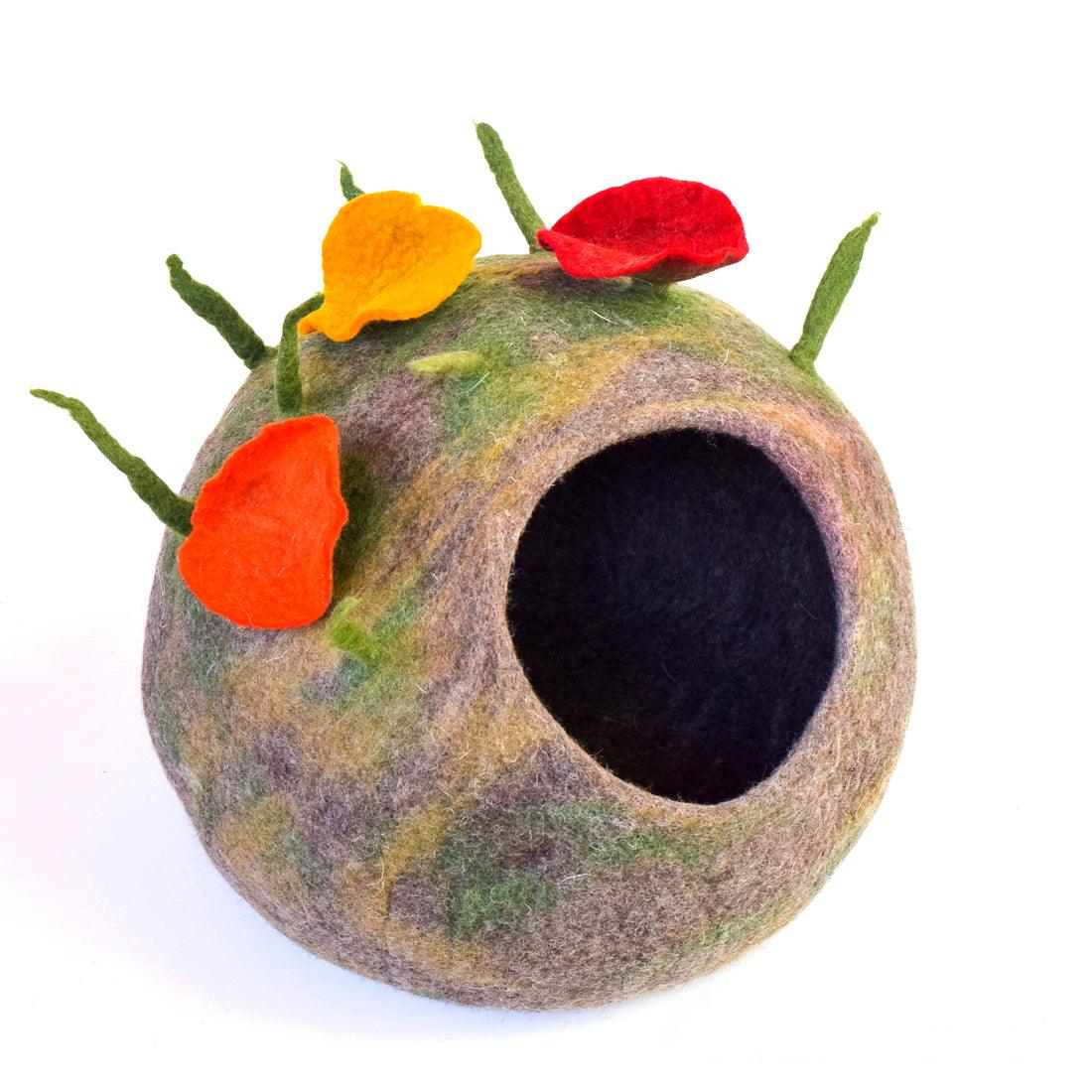 Pamper your feline friend with this cozy, woollen bed to snuggle into. This Green Forest cat cave design, with bright flowers and spikes, will also add a magical touch to your home while keeping your cat warm and fuzzy.