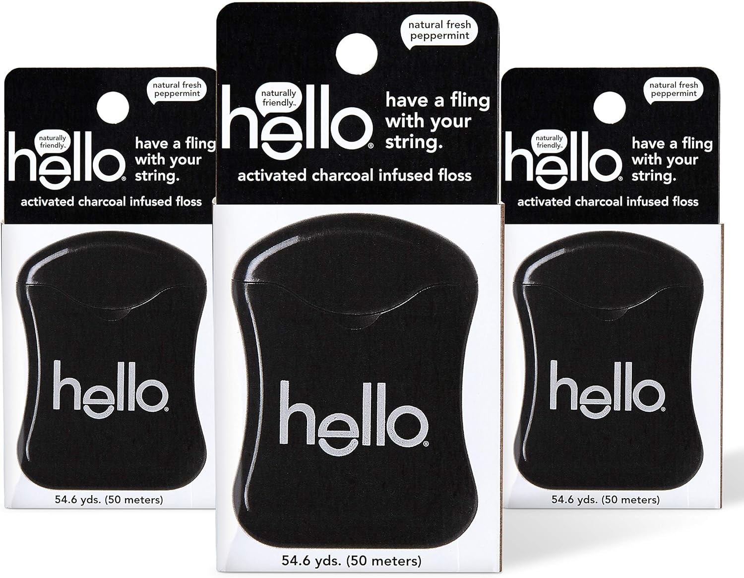 Have a fling with your string with hello activated charcoal infused floss. This thoughtfully designed black floss rocks activated charcoal from sustainable bamboo to remove plaque. The textured floss gently grabs and lifts away the nasty stuff hiding between your beautiful pearlies, and itÕs PFAS-free and coated with vegan candelilla wax thatÕs formulated with xylitol so you can get down to business, easy-peasy. Best of all, you don't have to worry about shredding, the string is non-gmo and has a delicious natural peppermint flavor to make you smile. Hello is also vegan, cruelty free, and never tested on animals (leaping bunny certified and peta recognized). Choose friendly.